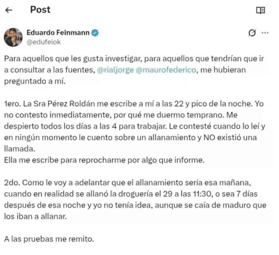 La respuesta de Eduardo Feinmann no se hizo esperar. En un extenso hilo en su cuenta de X, el periodista calificó la maniobra como un intento de «ensuciarlo» y ofreció su versión de los hechos: Pérez Roldán le escribió a él alrededor de las 10 y media de la noche. No hubo tal llamada y él contestó a las 4 de la madrugada porque es el horario en que se levanta para trabajar. Para sostener su descargo, Feinmann publicó capturas de pantalla de ese intercambio de WhatsApp y subrayó un punto central: el allanamiento a la droguería Suizo Argentina fue siete días después de aquel contacto, el 29 de agosto de 2025. «¿Cómo voy a adelantar un allanamiento que ocurrió una semana después y del que no tenía idea? Aunque se caía de maduro», disparó el conductor, desafiando a la Justicia a investigar el caso y ofreciendo su teléfono personal como prueba.